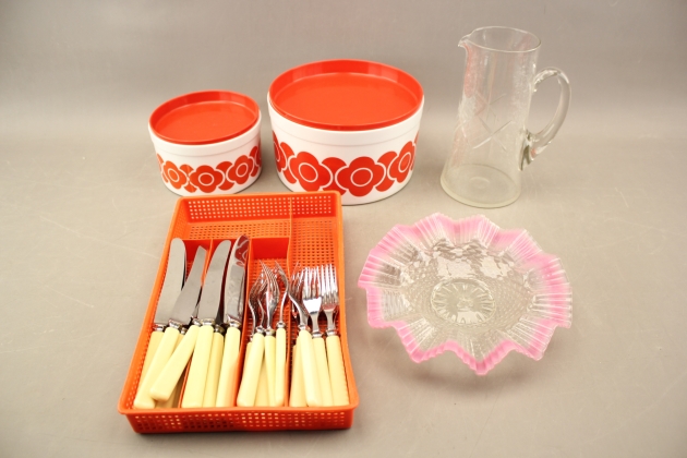 37. Bestick Jernbolaget Eskilstuna, plastburkar 2 st, kanna och skål