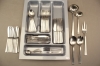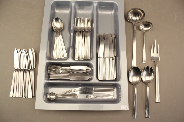 Matskedar 6 st, matgafflar 10 st, matknivar 11 st, förrättsknivar 8 st, förrättsgafflar 5 st, fiskknivar 12 st, teskedar 4 st, övriga bestick 10 st