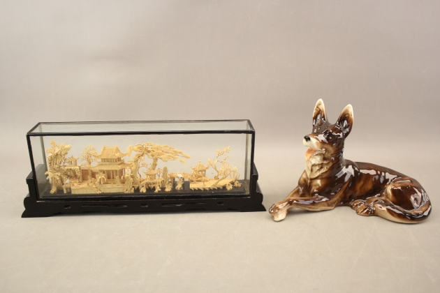 51. Diorama skuren kork i glasmonter med träsockel, orientalisk, senare 1900-tal och figurin i porslin