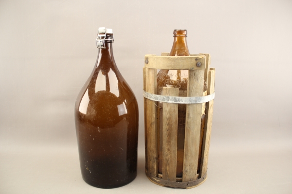 38. Glasflaskor 2 st varav ena i träställning