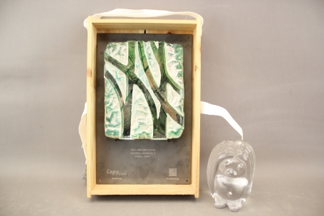 22. Glaskonst på metallplatta "Projekteringen Norra Länken 2 1994-97" och glastroll