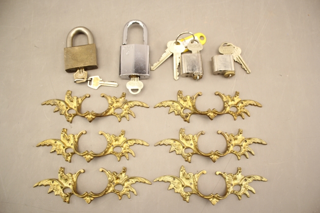 129. Hänglås 2 st, lås 2 st och möbelbeslag rokokostil i mässing 6 st
