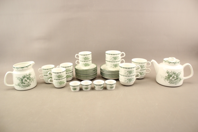 Tekoppar 6 st, tefat 6 st, kaffekoppar 8 st, kaffefat 8 st, äggkoppar 4 st, kanna och kaffekanna