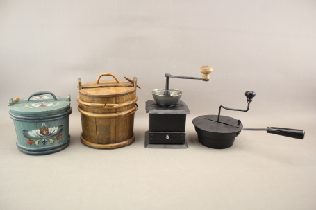 14. Kaffekvarn, kafferost och hinkar i trä 2 st