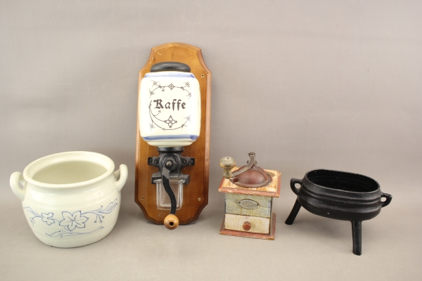 3. Kaffekvarnar 2 st, kruka och trebening i gjutjärn