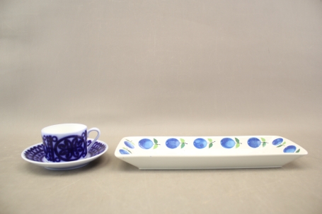 2. Kopp med fat "Blå Husar" och fat "Prunus" Gustavsberg