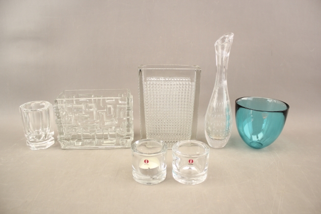 340. Ljuslyktor 1 par, vaser 4 st och skål bla Kosta Vicke Lindstrand och Iittala