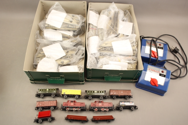 224. Lok 2 st, vagnar 9 st, räls och transformatorer 2 st Märklin