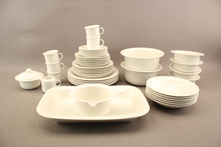 Mattallrikar 5 st, halvtallrikar 6 st, assietter 6 st, djupa 6 st, kaffekoppar 5 st, kaffefat 6 st, skålar 6 st, såskanna, uppläggningsfat, sockerskål och gräddkanna