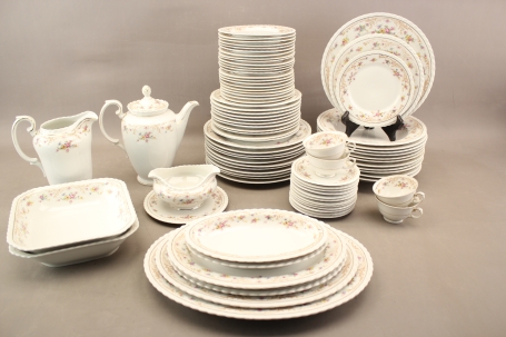 Mattallrikar 12 st, halvtallrikar 12 st, djupa tallrikar 11 st, assietter 23 st, uppläggningsfat 6 st, skålar 2 st, kanna (naggad), såsskål, kaffekoppar 4 st, kaffefat 12 st
