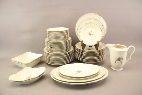 Mattallrikar 11 st, halvtallrikar 12 st, djupa tallrikar 11 st, assietter 11 st, skålar 4 st, uppläggningsfat 4 st och kanna