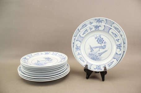 24. Mattallrikar 4 st och assietter 10 st Rörstrand "Fågel blå"