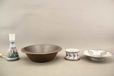 3. Skålar 3 st och bordslampa bla Höganäs och Bo fajans