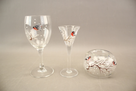 6. Vinglas 6 st, snapsglas 5 st och ljuslykta med handmålad dekor Tingsgården