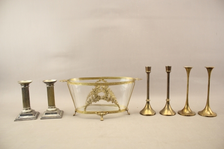 53. Ljusstakar 6 st och jardinjär i bla mässing