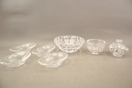 42. Skålar 2 st, lockskål Orrefors och serveringsskålar Kosta "Party" 4 st