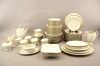 Mattallrikar 12 st, halvtallrikar 12 st, djupa 12 st, uppläggningsfat 8 st (en har nagg undertill), såsskål, kaffekoppar 12 st, kaffefat 12 st, assietter 11 st, sockerskål, gräddkanna, kaffekanna och kanna