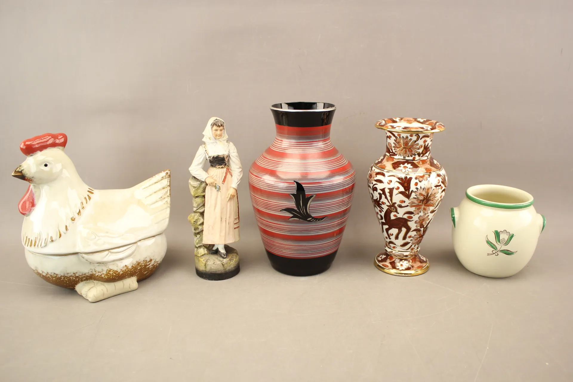355. Äggömma, kruka, vaser 2 st och figurin