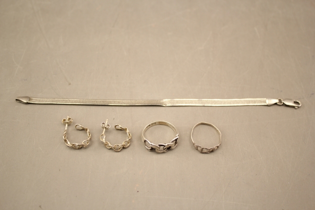 150. Örhängen 1 par, ringar 2 st "Bismarck" och armband i silver