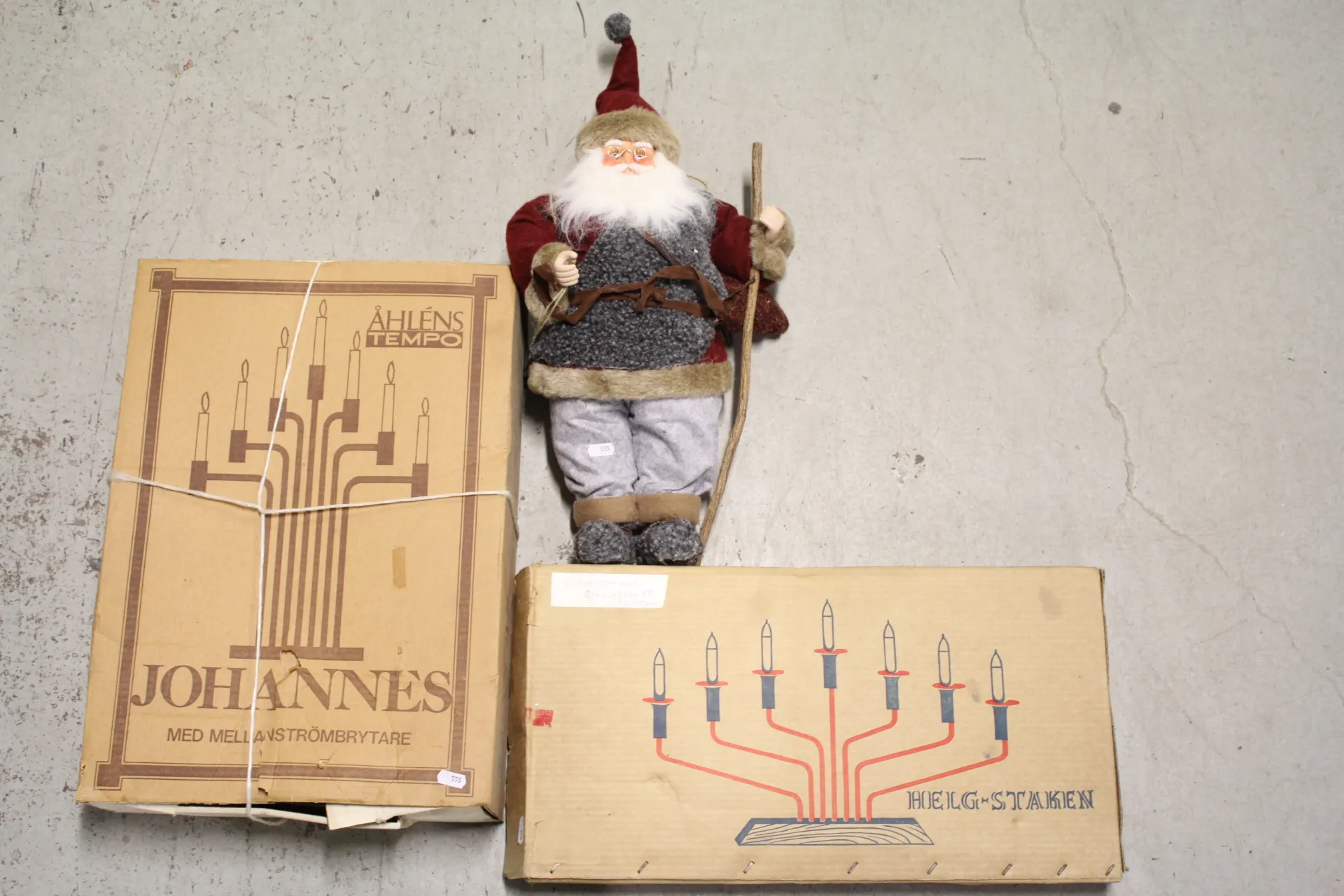 555. Adventsljusstakar 2 st i bland annat teak och mässing och dekorationstomte