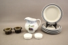385. Assietter 5 st, äggkoppar 1 par, småfat 2 st och kanna Arabia