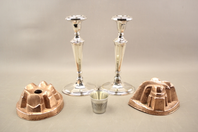 150. Bägare i tenn "Alton" K-E Palmberg, ljusstakar 1 par i nysilver och aladobformar 2 st