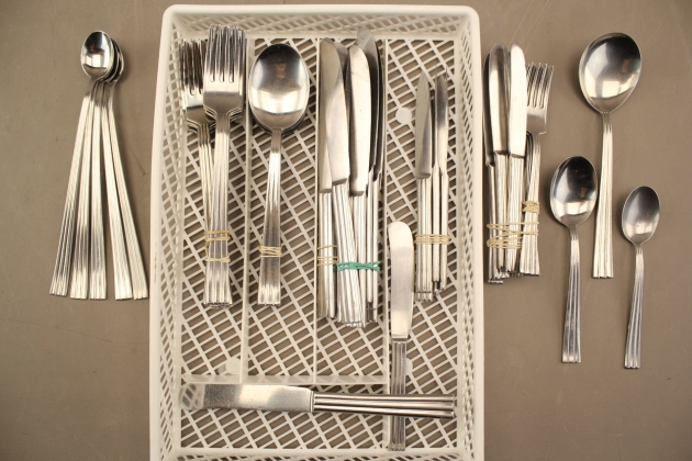 Matgafflar 12 st, matknivar 12 st, matskedar 8 st, smörgåsgafflar 7 st, smörgåsknivar 7 st, smörkniv 2 st, fruktknivar 5 st, diverse skedar 8 st