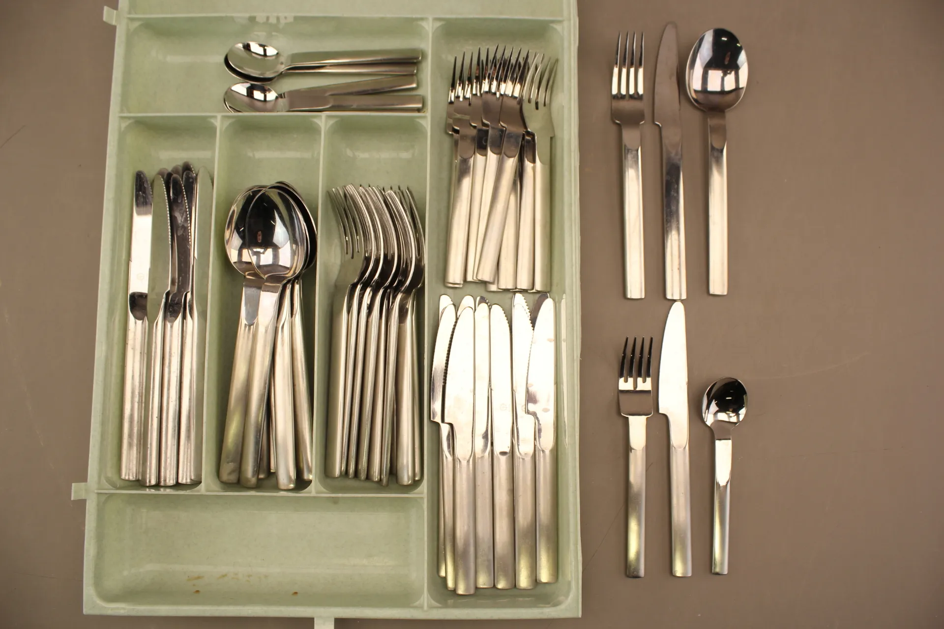 Matknivar 12 st, matskedar 12 st, matgafflar 12 st, fgörrättsgafflar12 st, förrättsknivar 12 st, dessertskedar 6 st