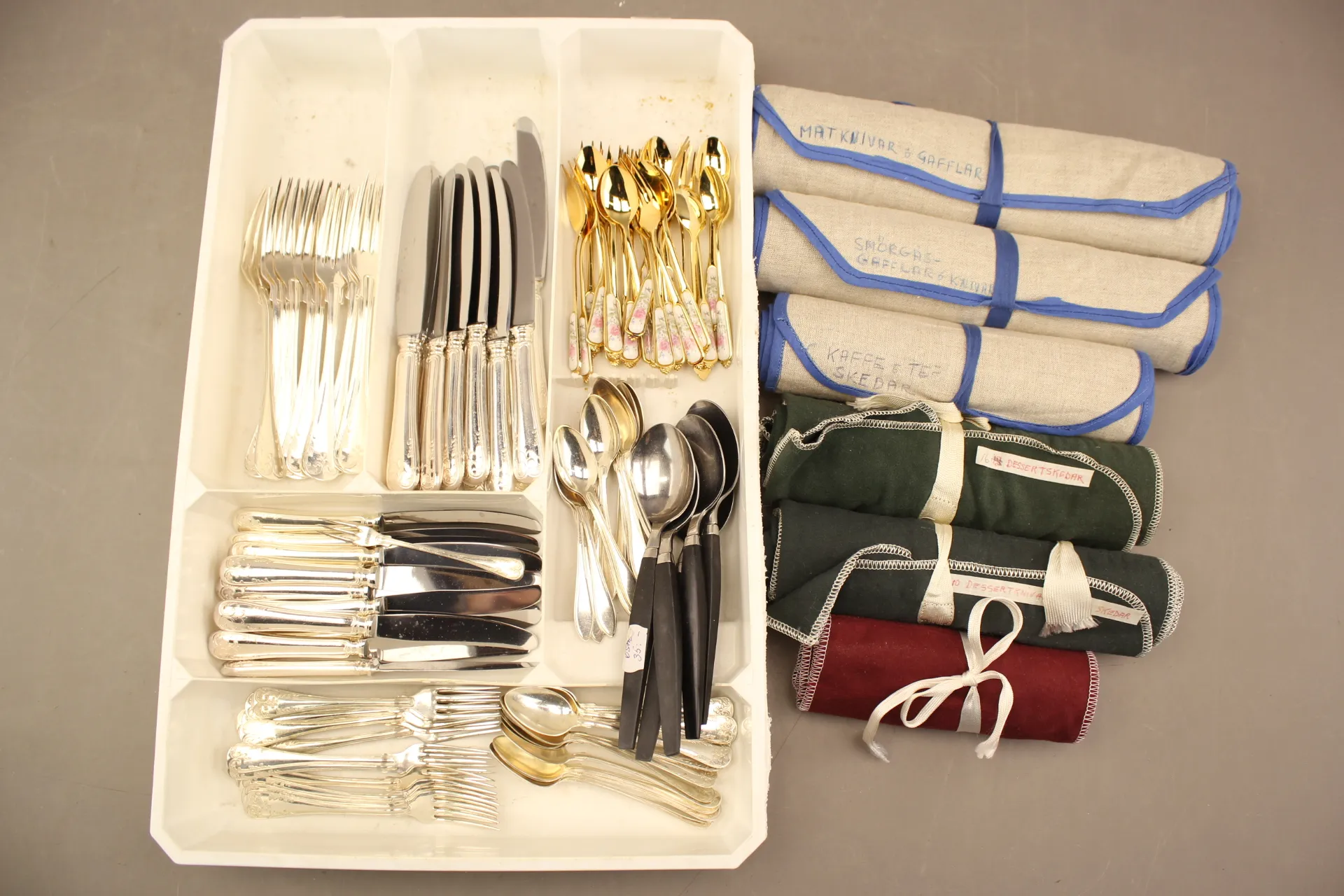 199. Bestickuppsättning i nysilver, blandade bestick och bestickfodral 6 st