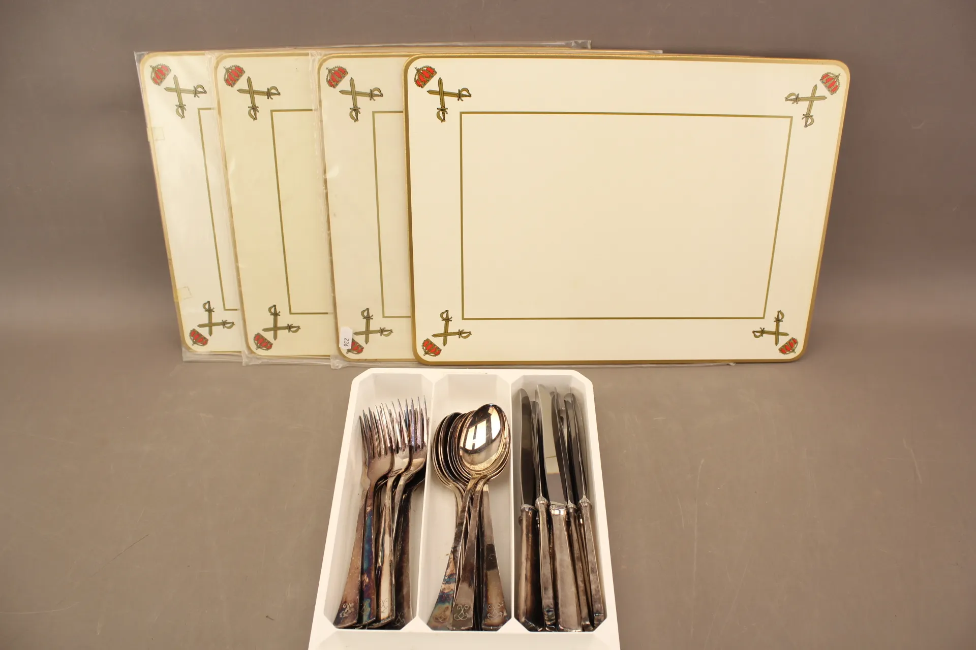 236. Bestickuppsättning i nysilver Hallbergs 36 delar och bordstabletter 4 st