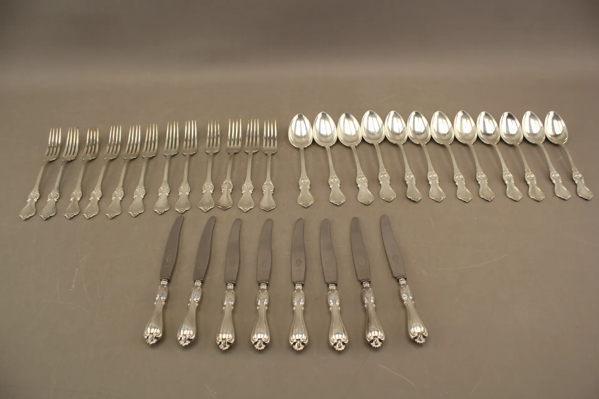 Matgafflar 12 st 493,7 g, matskedar 12 st 479,5 g, matknivar 8 st 357,9 g vägda med rostfria blad, totalvikt: 1331,1 g