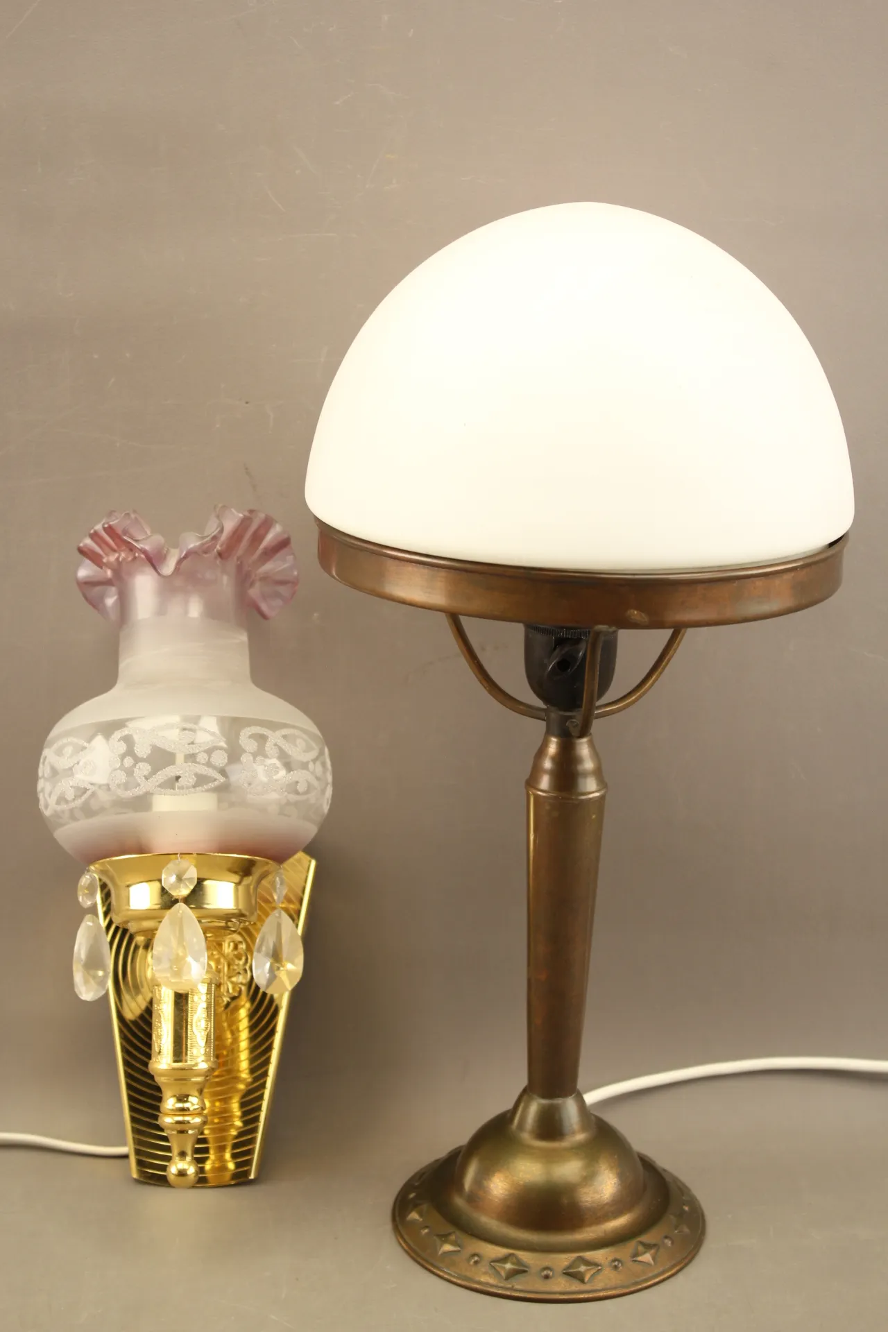 217. Bordslampa i glas och koppar och vägglampa