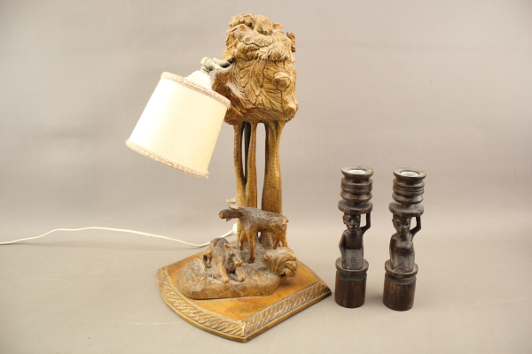 272. Bordslampa i trä sign T. Lindahl och ljusstakar 1 par