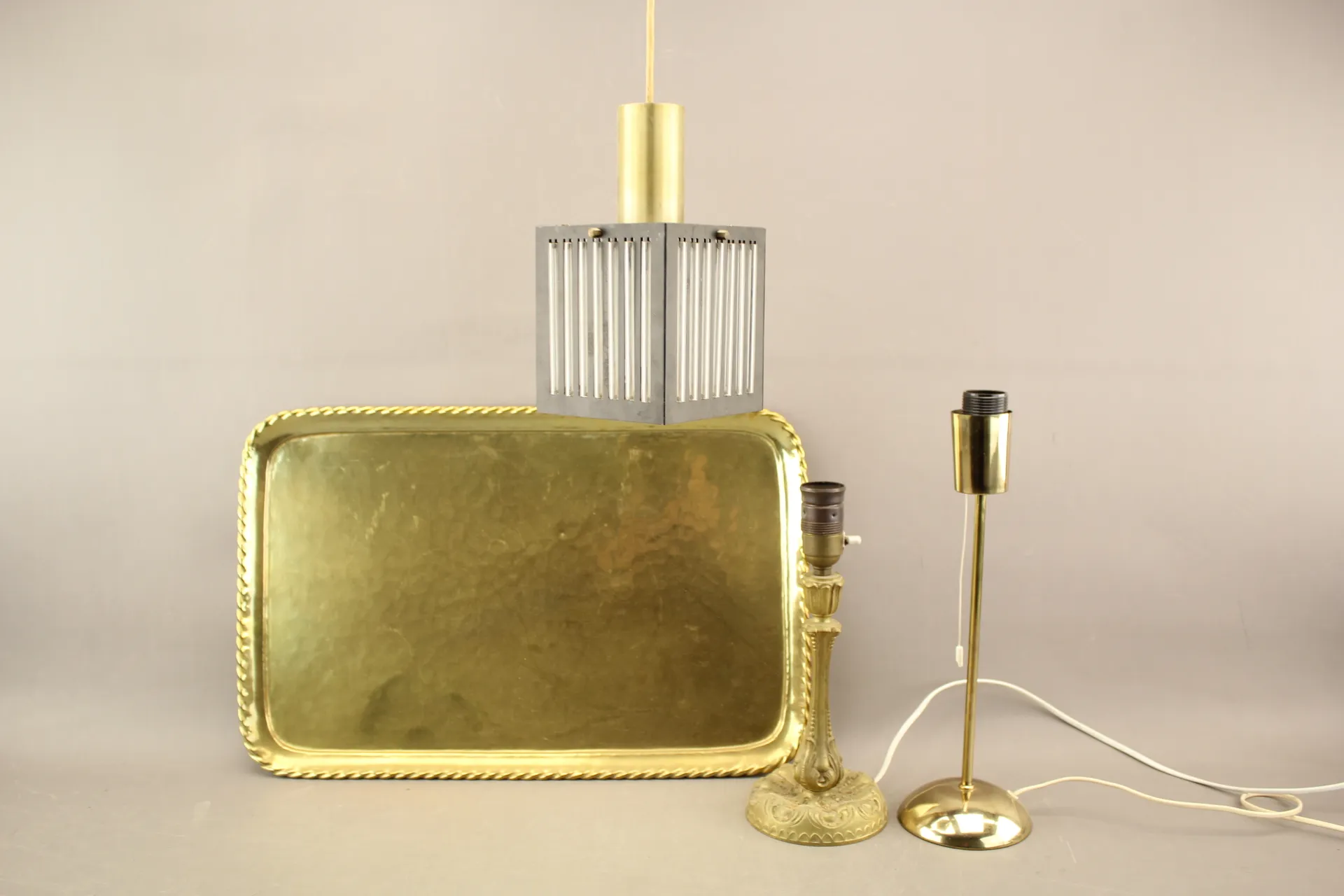 123. Bordslampor i mässing 2 st, taklampa och bricka