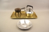 148. Bricka i mässing, trebening, kaffekanna och skål