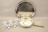 221. Bricka i nysilver C. Gråström, skål, klämmor och skrin i tenn GAB