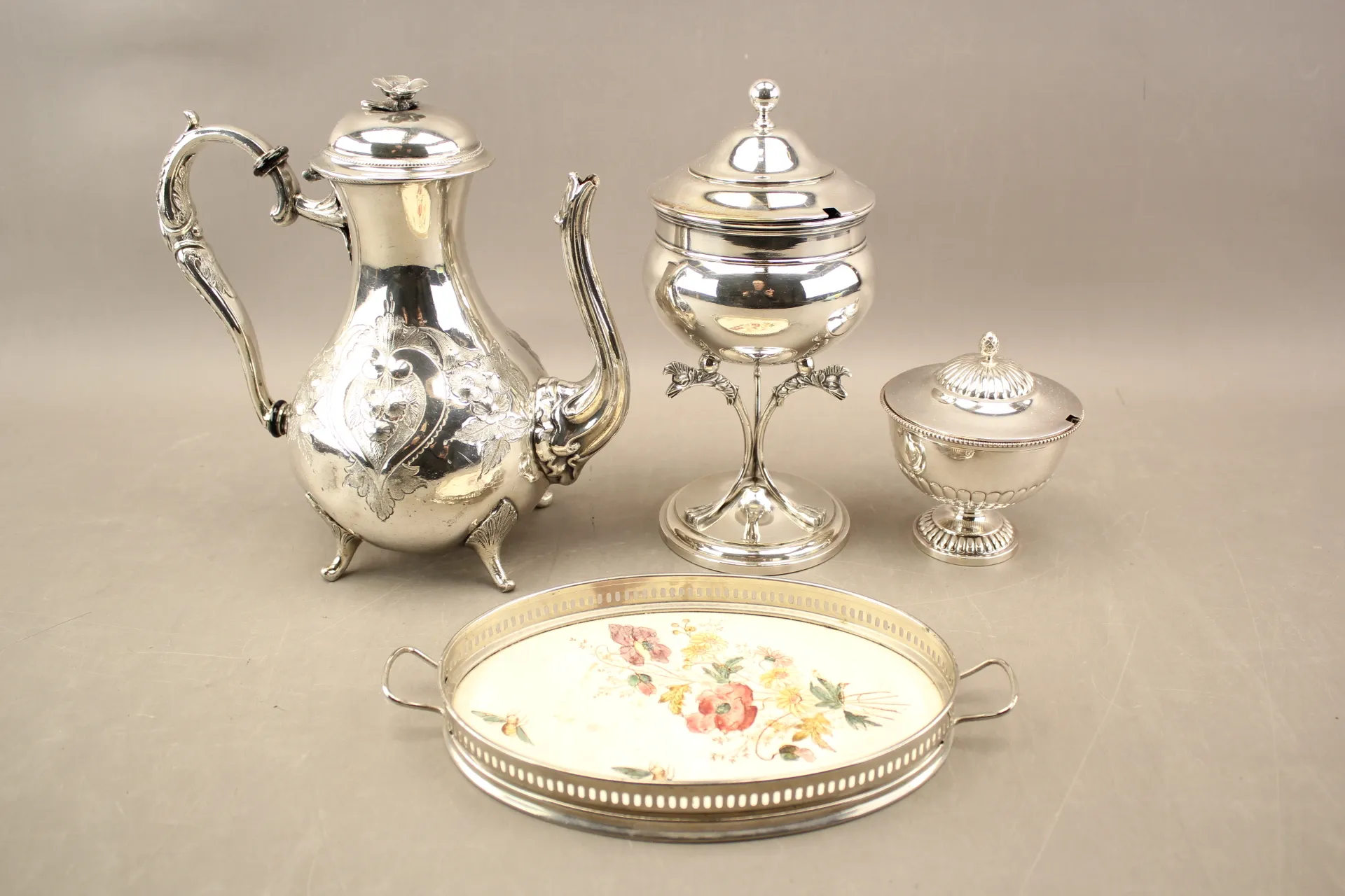 232. Bricka, kanna och skålar på fot 2 st i nysilver