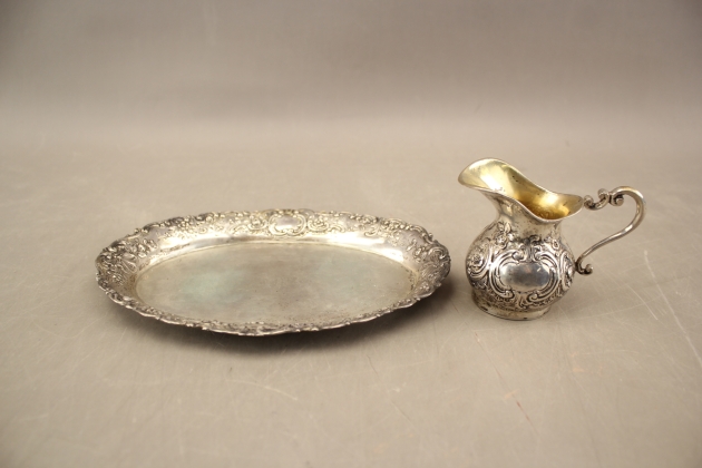 138. Bricka och gräddkanna i silver stämplat 800