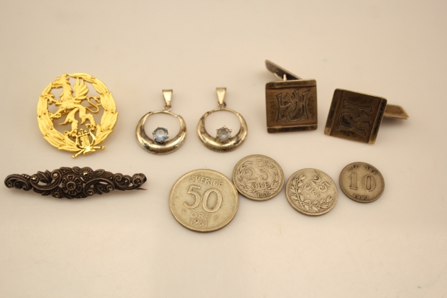 141. Broscher 2 st, örhängen 1 par, manschettknappar 1 par och mynt 4 st i silver