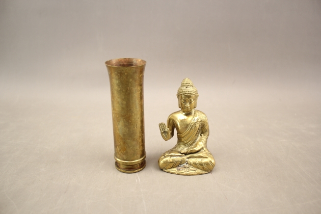 8. Buddhaskulptur och vas i mässing gjord av en mässingspatronhylsa