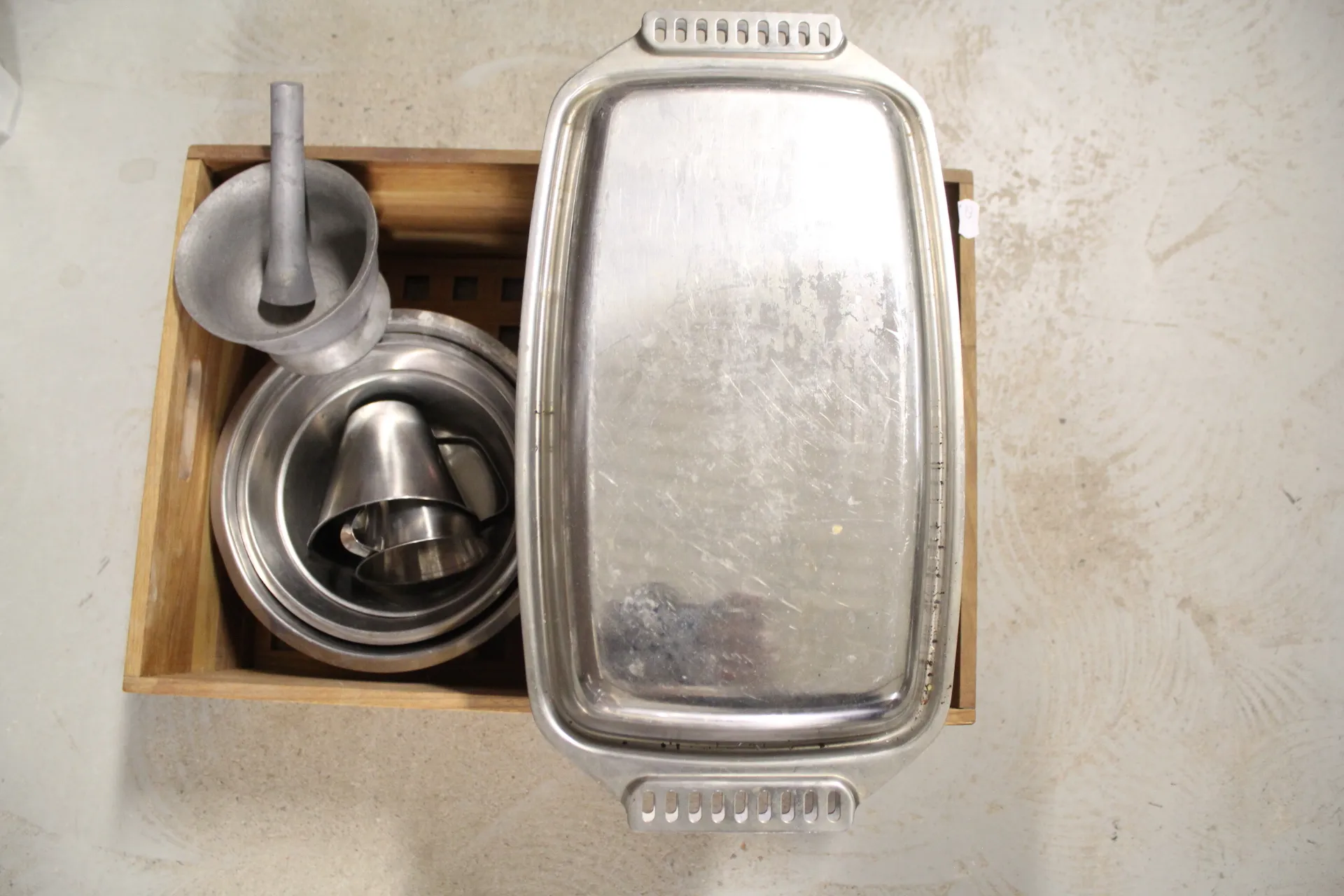 425. Bunkar, mått, fiskgryta, mm i trälåda