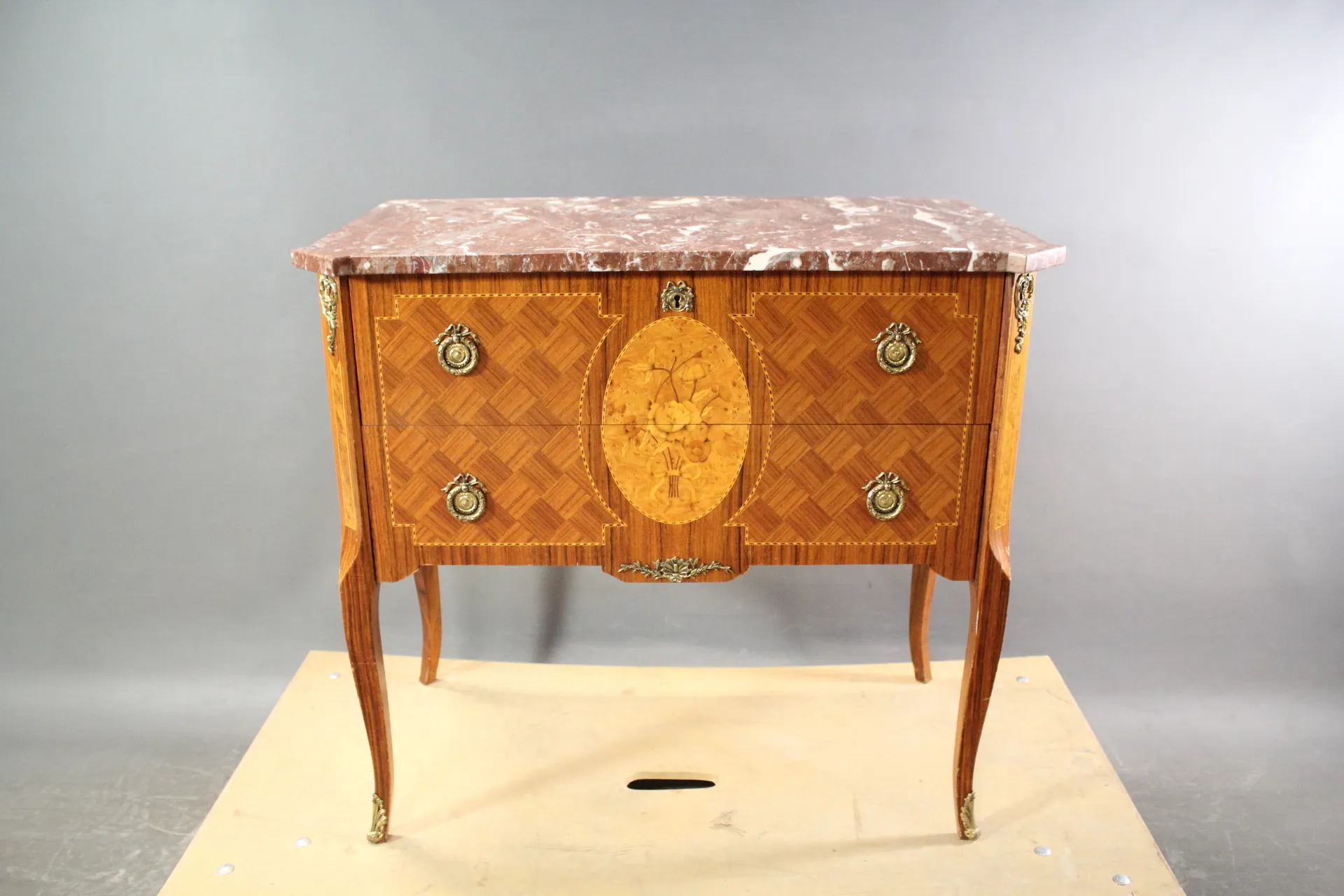 252. Byrå i gustaviansk stil med mässingsbeslag och stenskiva