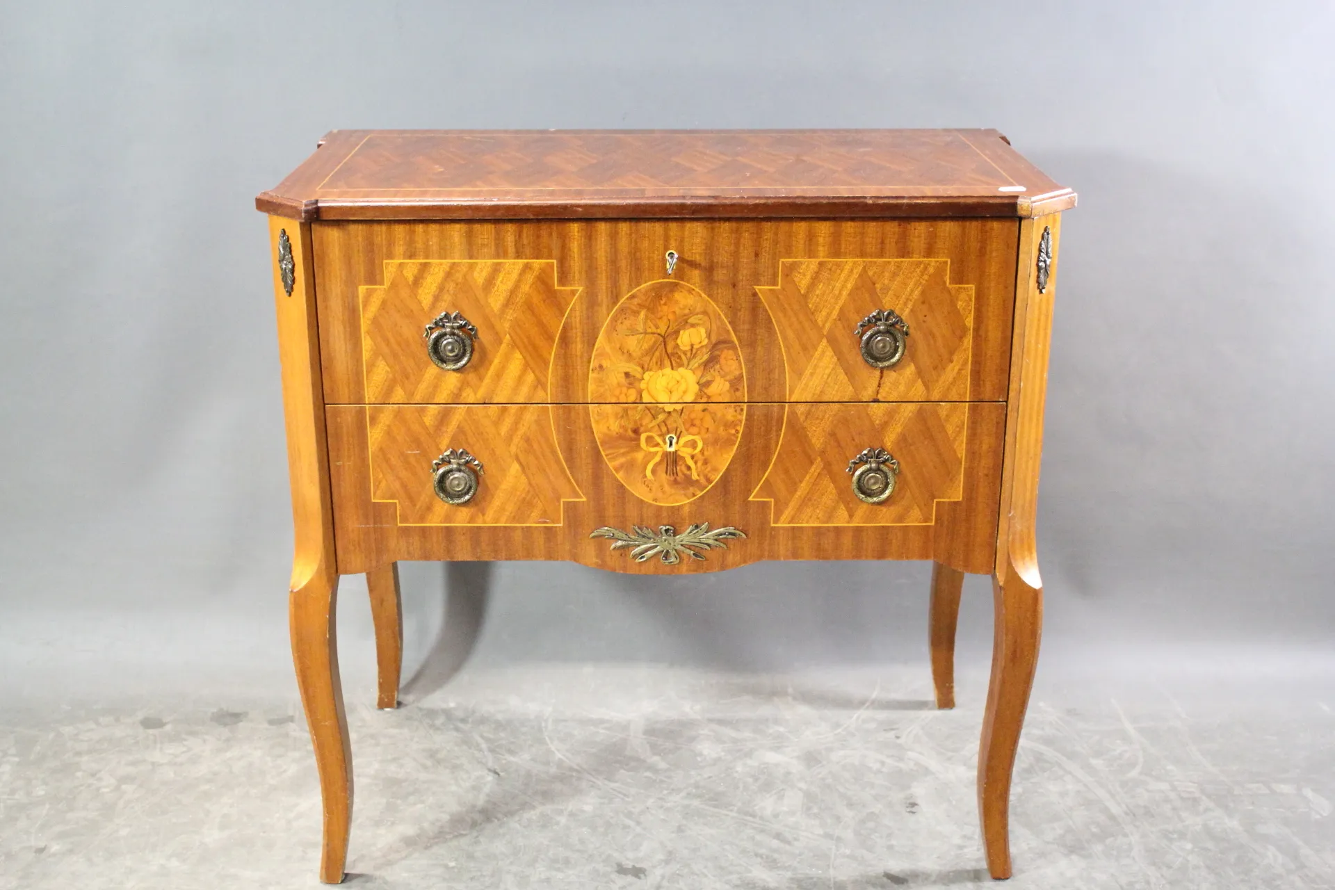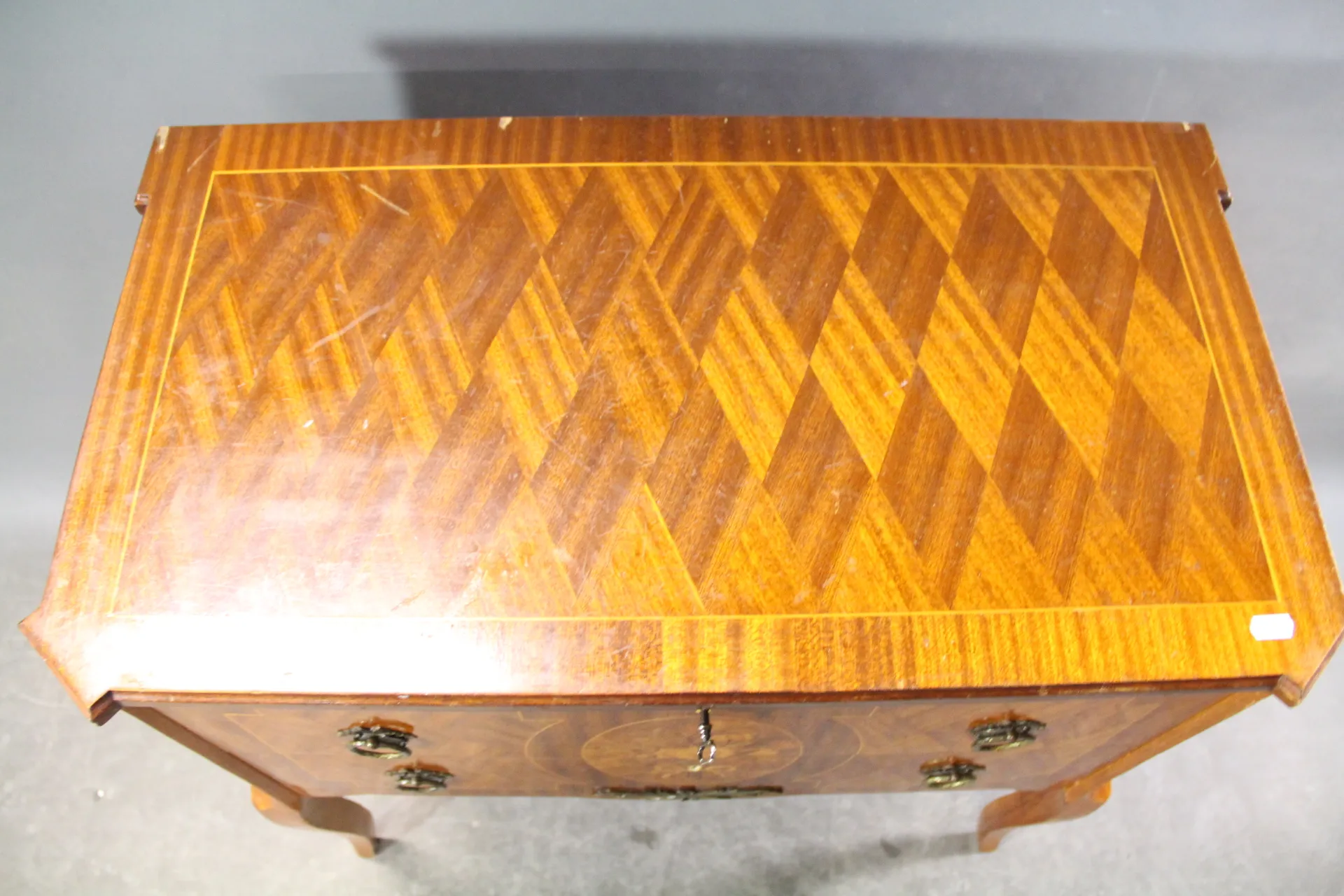 H: 76 cm, 80 x 44 cm, nyckel finns, skador finns