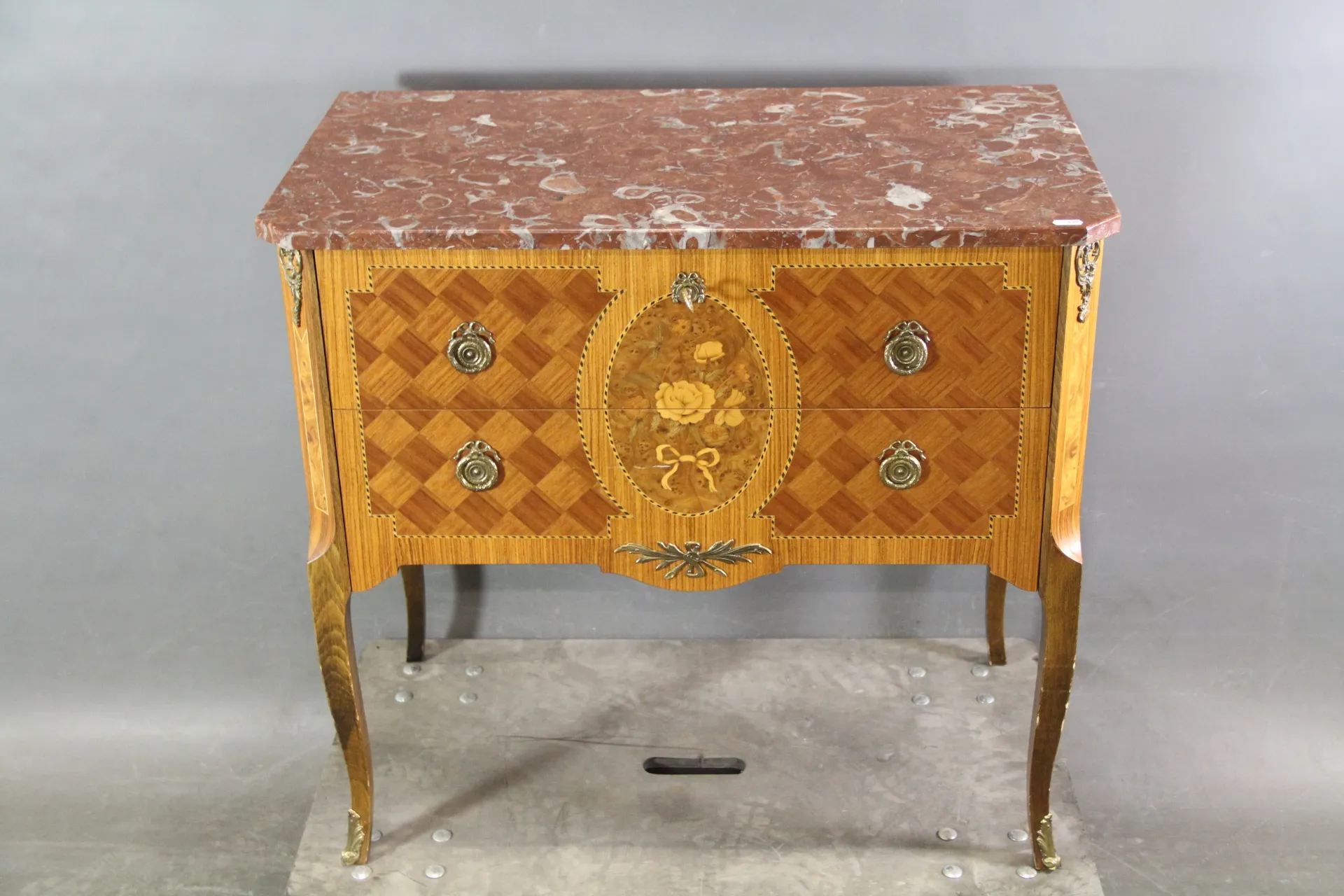 438. Byrå med mässingsbeslag och stenskiva