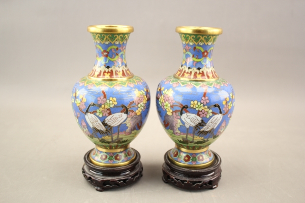 302. Cloisonné vaser i mässing på träsockel 2 st