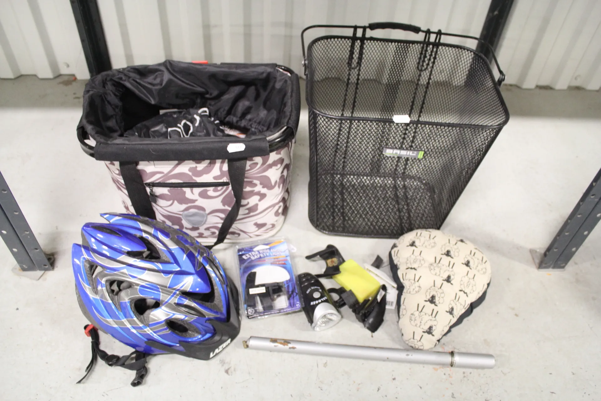 517. Cykelkorgar 2 st, hjälm och diverse tillbehör