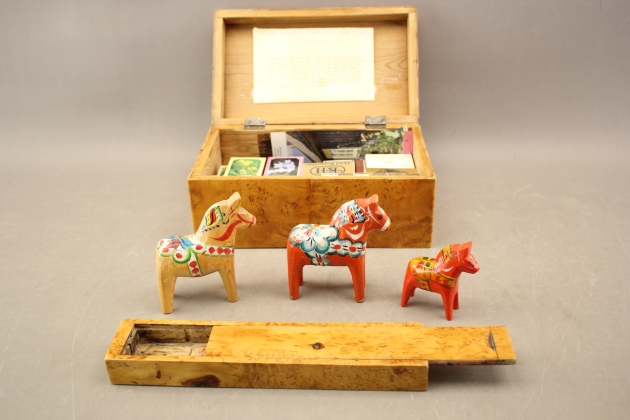 246. Dalahästar 3 st, skrin, pennskrin mm