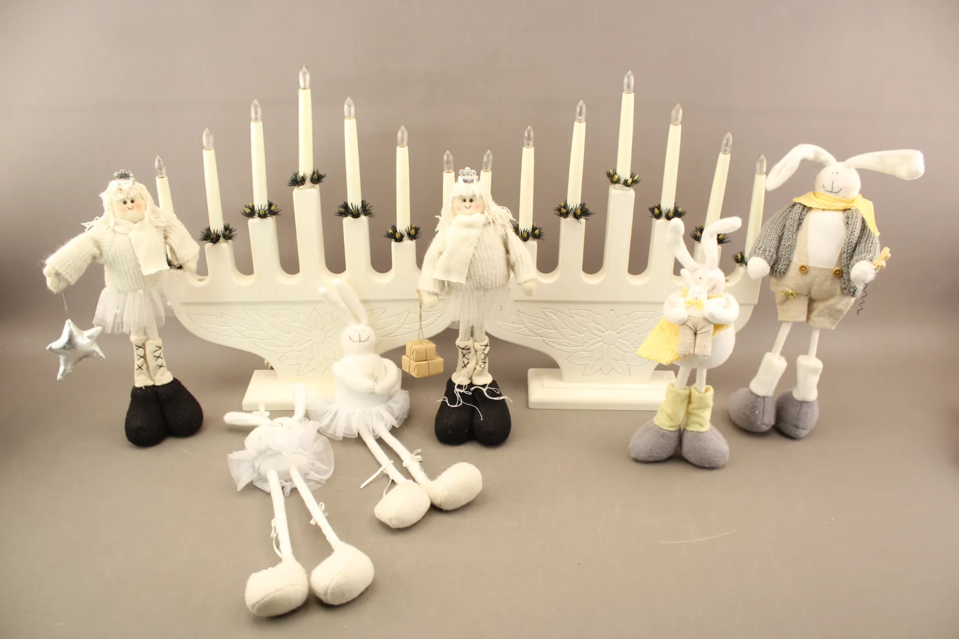 394. Dekorationer i tyg 6 st och adventsljusstakar 2 st