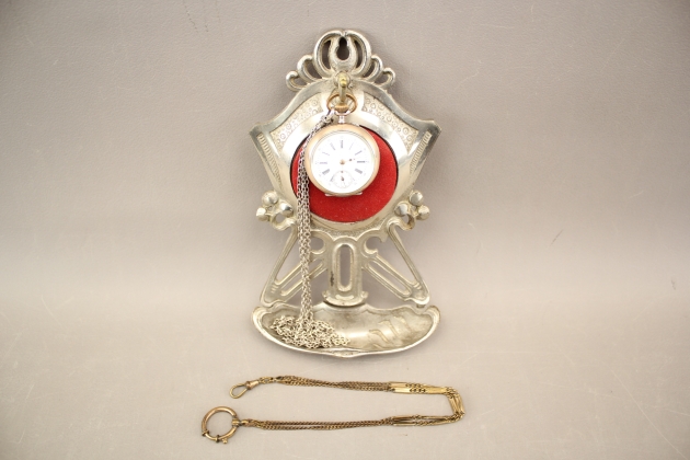 176. Fickur i silver, klockkedjor 2 st och klockställ