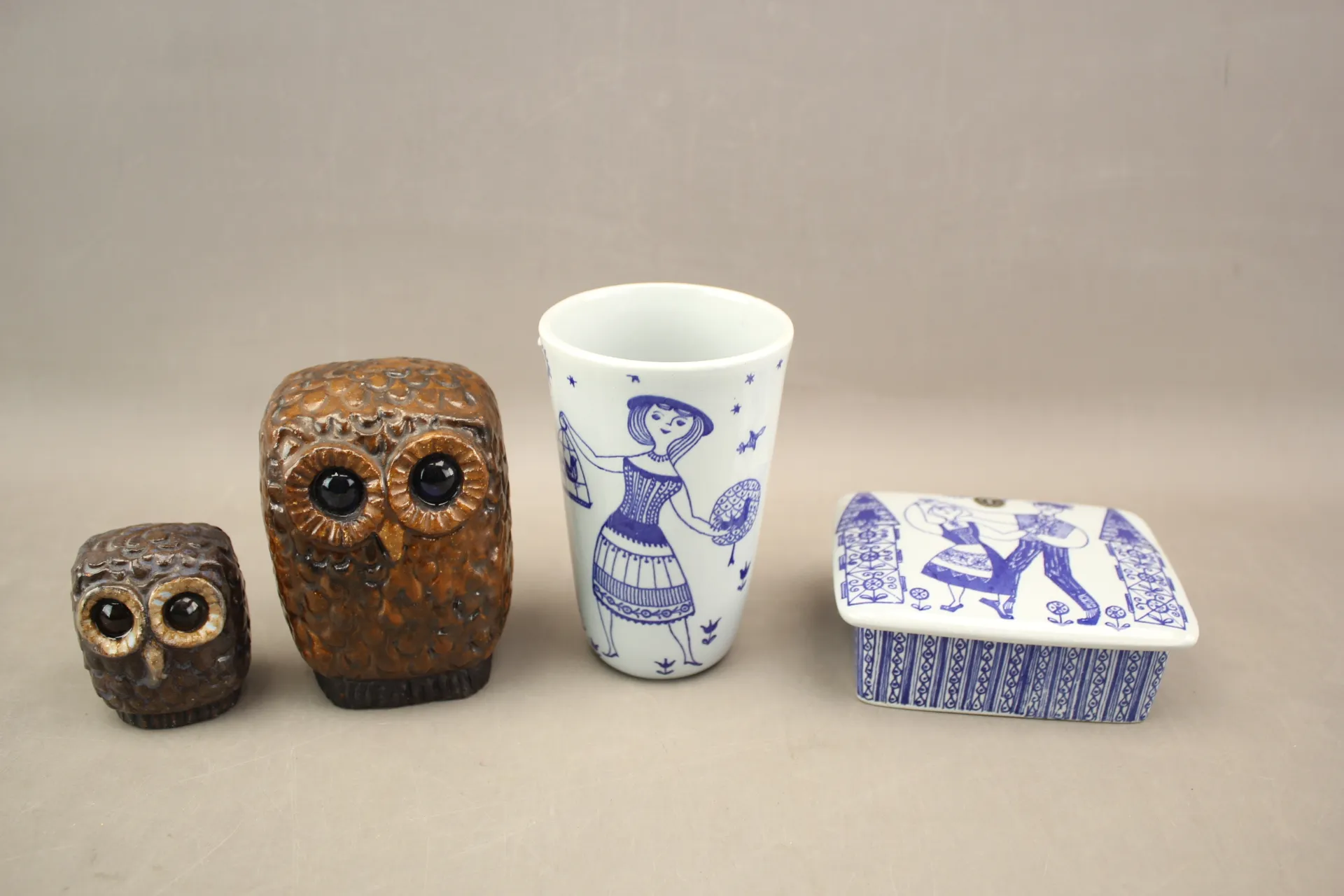 408. Figuriner Lars Bergsten 2 st, vas och lockskål Stavangerflint